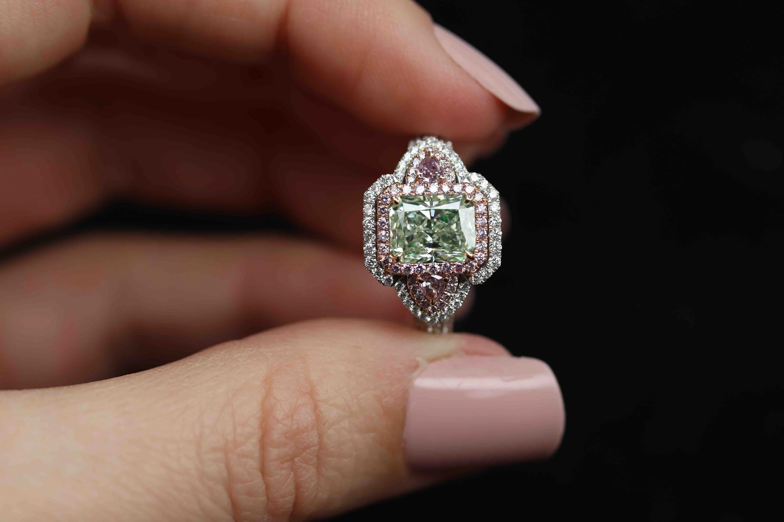 A fabulous 1.75ct Radiant Fancy Yellowish Green SI1 Natural Diamond set in 18K White Gold with stunning pink and colorless natural diamonds totaling 0.87cts.